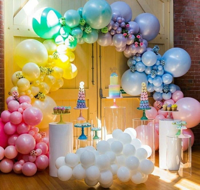 - Những bông hoa trang trí theo màu sắc của bong bóng làm nổi bật cho dây bong bóng