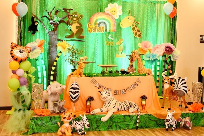 Kế đến là bộ backdrop sinh nhật phía sau với tấm vải voan vàng tươi năng động cùng một bộ dây bong bóng xanh lá mang đến một cảm giác rừng rậm cho buổi tiệc hôm ấy. Một trụ giấy giả thân cây cũng được đạt ở góc trái theo hướng người nhìn của backdrop giúp cho bộ sản phẩm thêm sinh động và thú vị.