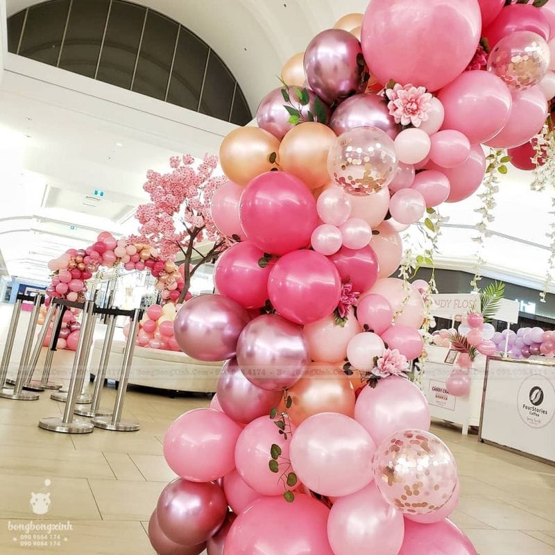 Thiết kế mặt trước cũng như mặt sau đều sử dụng chiếc cổng bong bóng vòm với tông màu hồng để trang trí. Chiếc cổng bong bóng này thiết kế tuy không quá lớn nhưng có thể bao quát toàn bộ vị trí trang trí. Bong bóng trang trí cho cổng sử dụng tông màu hồng với nhiều sắc độ khác nhau cùng với kích thước bóng có đôi chút không giống nhau để bộ sản phẩm có thể sinh động và độc đáo thu hút sự chú ý của du khách tham quan đi ngang qua đây.