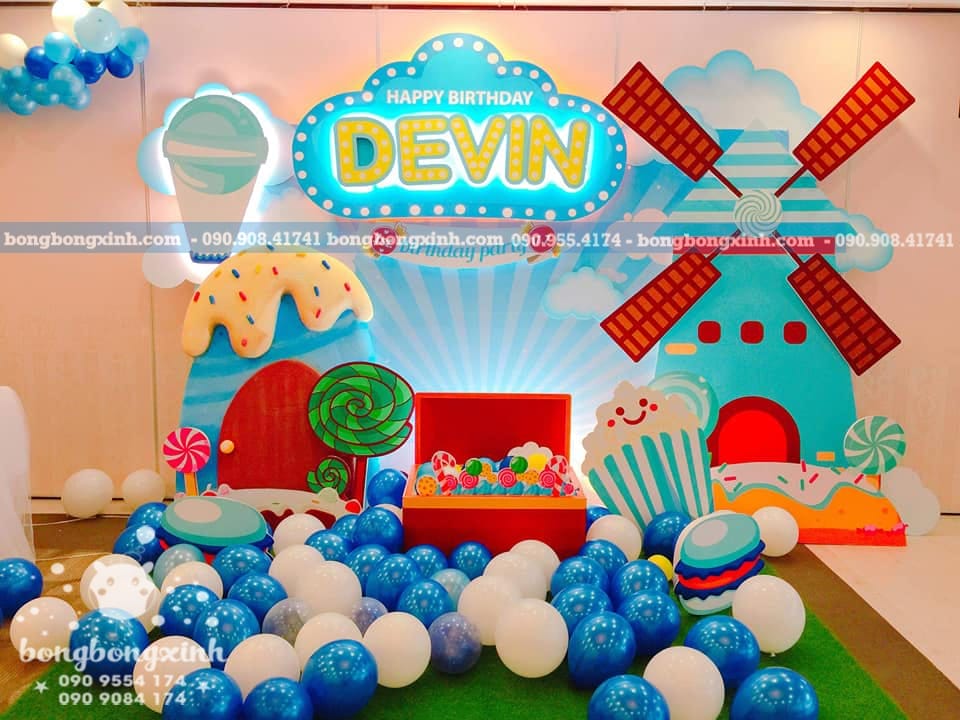 Backdrop chủ đề Candy 024 được thiết kế để trang trí cho buổi tiệc sinh nhật của bé trai trong dịch vụ trang trí sinh nhật trọn gói tại dịch vụ trang trí sinh nhật Bong Bóng Xinh. Với thiết kế độc đáo, sáng tạo và cũng rất đáng yêu bởi cách sử dụng kết hợp các phụ kiện trang trí sinh nhật dùng trong bữa tiệc được thiết kế và lên ý tưởng bởi dịch vụ trang trí sinh nhật Bong Bóng Xinh.